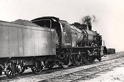 ![]() Locomotive 140 J avec installation de camouflage sur le tender et bâche enroulée sur la cabine. Pour éviter de voir les lueurs du foyer par l'aviation pendant le chargement de celui-ci ( défense passive ) JC Capdeville janv. 2007 |